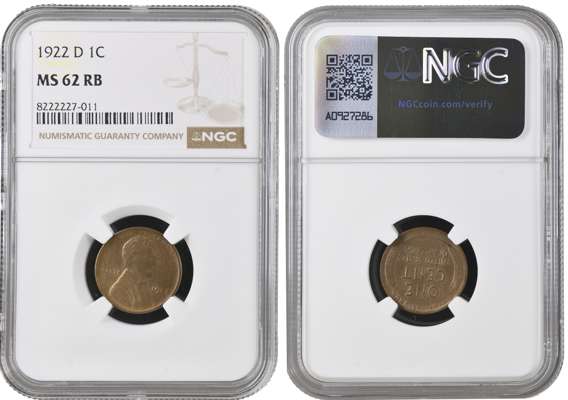 USA, Lincoln bronze Cent, 1922 D, Denver, 3.09g (KM 132). In NGC holder graded MS 62 RB (8222227-011).