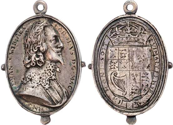 (43x30mm. including lugs/9.23gm), by Thomas Rawlins, silver, bust of Charles I with falling lace collar right, CAROLVS.DG.MAG BRI FR.ET.HIB.RX around, rev. Crowned shield, Garter around, plain surround, (MI i 360/231; Eimer 167). Very Fine, later cast than above, details not as sharp.