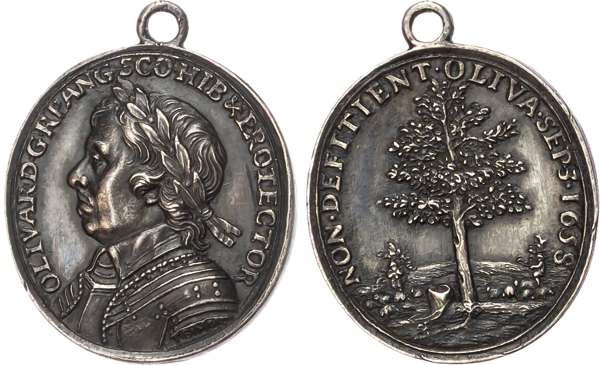 (21x19.5mm. not including loop/3.09gm.) by J. Stuart after T. Simon. Laureate and cuirassed bust left, OLIVAR . D . G . RP ANG . SCO . HIB & PROTECTOR. rev. Shepherd standing below olive tree, tending to his flock, NON . DEFITIENT . OLIVA . SEP . 3 . (MI 433/82, Eimer 202b). Extremely Fine and handsomely toned.