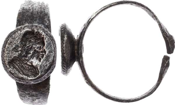 Bezel with an incuse image or the bust of Charles I riveted onto ring, (broken). Sold with wax seal showing impression. Cleaned but with rust pockmarks.