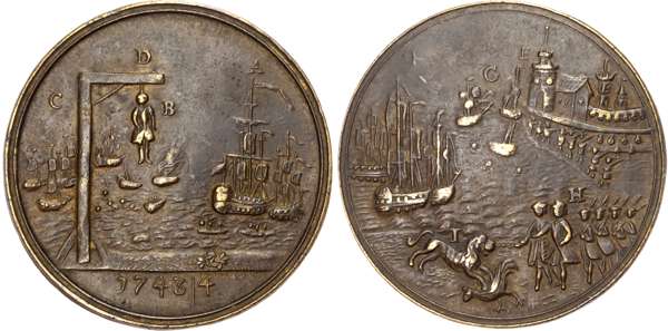 In 1744, a combined Franco-Spanish fleet put to flight Britain's Mediterranean fleet just off the French naval base of Toulon. It was regarded as a mortifying defeat and the admiral in command, Thomas Matthews, was court-martialled in 1746 for leading the fleet into action, in a chaotic fashion which resulted in the fleet fleeing, in total disorder, from the pursuing Franco-Spanish. Mathews was dismissed from naval service. It is most likely that a pamphlet was issued accompanying this enigmatic medal, spelling out the letter designations of the different aspects of the events, although hitherto, no such pamphlet has been discovered.