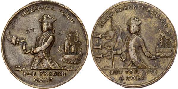 Half-length figure of General Blakeney, holding British flag and baton which points to ship at right, fort firing cannon at left, BRAVE BLAKNEY REWARD above, BUT TO B GIVE A CORD in exergue, rev. Half-length figure of Byng receiving a purse WAS MINORCA. SOLD BY B, in exergue FOR FRENCH GOLD, ‘was’ and ‘by b’ stamped in rev. field, 35mm/14.36gm. (MI ii 680/395v; Eimer 653v), Good Very Fine, yellow brass toning.