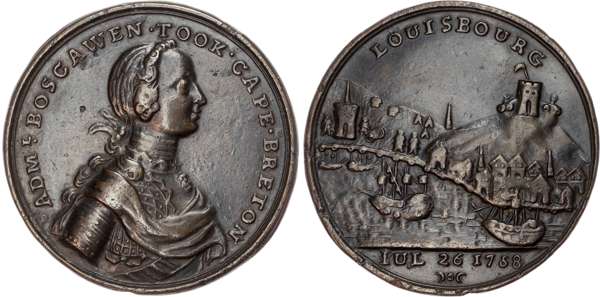Bust of Boscawen right, wearing sash over armour, ADML BOSCAWEN TOOK CAPE BRETON, rev. ships in harbour, beyond cannon fires at fortress, LOUISBOURG / IUL 26 1758. 40mm/15.35gm. (MI 689/411; Eimer 659; Betts 403; Breton 39; Leroux 851; Ford XIV, 22-24). Almost Extremely Fine for issue, (crude), evenly toned, very rare.