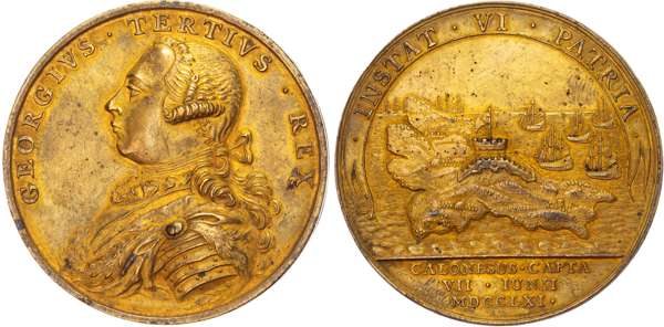 Armoured bust of George III left, rev. Panorama of island with fort, ships beyond, INSTAT VI PATRIA. 23.96GM. (BHM 71; Eimer 687; MH 371). Extremely Fine with yellow ochre coloured toning.