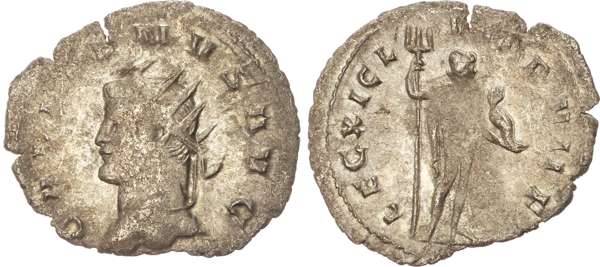 GALLIENVS AVG, radiate head left. Rev. LEG IX P VII P VII F, Neptune standing right, holding trident and dolphin. (RIC -). Very Fine. Weakly struck. Somewhat rough. Rare.