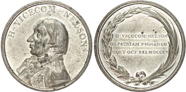 Uniformed bust of Nelson left rev. three-line Latin inscription, H. VICECOM NELSON..., within wreath of palm and laurel, 39mm/16.70. (Hardy 67: BHM.581; MH.505). Good Extremely fine with much original lustre.