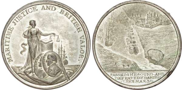 Justice with sword and scales standing by two medallions with the portraits of admirals Parker and Nelson, MARITIME JUSTICE AND BRITISH VALOR, rev. View of the battle of the two fleets with the city in the background, PASSED THE SOUND AND DEFEATED DANISH FLET MAR 30. 39mm/23.96GM. (BHM 510; Eimer 933), Good Extremely Fine with fair amount of original lustre.