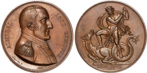 By L. Brenet and Gerard for Mudie's British Victories Series. Uniformed bust right, of Lord Exmouth, ADMIRAL LORD EXMOUTH, Reverse: Neptune, with trident, pacifying a sea-horse, In Exergue: ALGIERS AUGUST. 41mm//35.06gm. (BHM 921, Eimer 1085). Good Extremely Fine, bronzed and evenly toned with underlying brilliance.