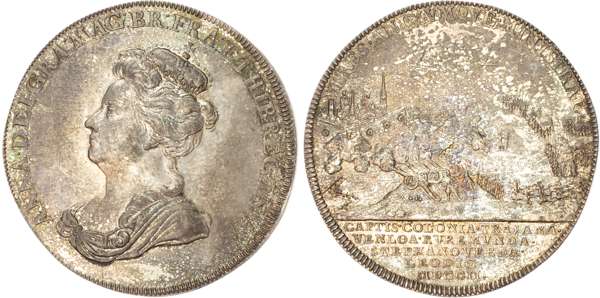 Crowned bust left. Rev, a panorama of the bombardment of Liège, with cannon firing on the city (Eimer 396; MI 241/26). About Extremely Fine, rev. better, dark mottled tone.