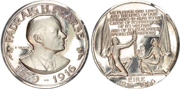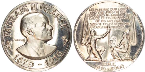 Pair of pure AR medals 1966, 50mm/71.55gm. and 38mm/35.77gm., by Paul Vincze, in hallmarked Britannia silver (.9854) for London with the date letter l, and issued by the Dublin Jewellers Worboys & Co. Ltd. Draped bust of Pearse right; rev. Two figures kneeling left and right, each holding banners, with the left holding a torch and the right holing a laurel branch, edge: plain, both numbered 0034, (Went 158; E 2109a&b). In the green leather box of issue with the dates 1916-1966 embossed in gold on top. [2] Pristine and in bright mint condition.