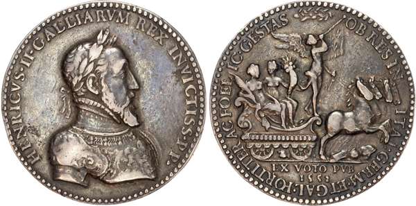 Early cast silver medal (54mm/40.96gm), unsigned. Laureate and armoured bust right, legend reads HENRICVS II GALLIARVM REX INVICTISS P P. Rev, Victory, holding palm frond, Abundantia, holding cornucopia, and Renown (Fama), blowing trumpet decorated with royal banner in ornate cart drawn by four horses prancing over banner and arms below, legend reads OB RES IN ITAL GERM ET GAL FORTITER AC FOELIC GESTAS, in exergue, EX VOTO PVB 1552 (Mazerolle II 99; Jones 65). About Very Fine, rare in silver.