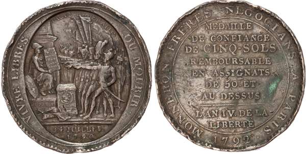 Medaille de Confiance type. Oath-taking Pact of the Fédéres, Live Free or Die. Rev, nine line inscription guarantees tokens' redemption in Assignats (KM Tn31). Near Very Fine, edge knocks.