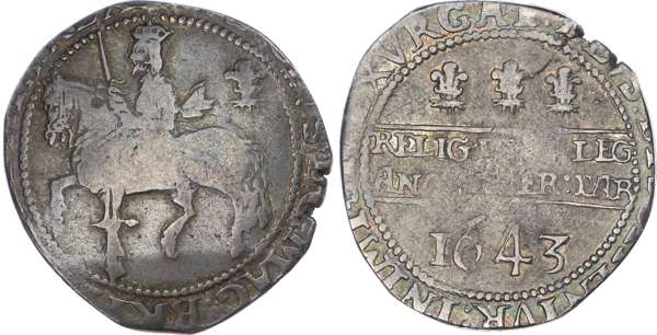 Charles I, (1625 ‑1649), AR Halfcrown, 1643, 12.41gm. Oxford mint, mm. plume on obv. only, crowned king on horseback, upright sword, sash flying out, Oxford plume behind, no groundline, rev. declaration in two lines, three Oxford plumes above, date below (Brooker 865, N 2413; S 2954). Fine for issue, rev. better.