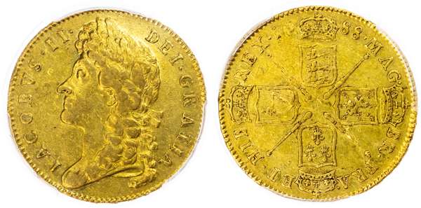James II (1685 ‑ 1688), Five Guineas, 1688, QVARTO, second laureate bust left, reverse crowned cruciform shields, sceptres in angles, (EGC 315; S.3397A). Good very fine or better. Underlying mint lustre. Encapsulated by PCGS as AU53.