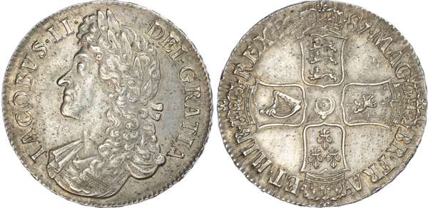 James II (1685‑88), Crown, 1687. Second laureate and draped bust left. Rev, crowned cruciform emblematic shields, six strings to Irish harp, edge inscribed in raised letters and dated TERTIO, 30.16gm (S. 3407; Bull 743; ESC 78). Choice Extremely Fine, minor adjustment marks as is typical, hair detail particularly strong.