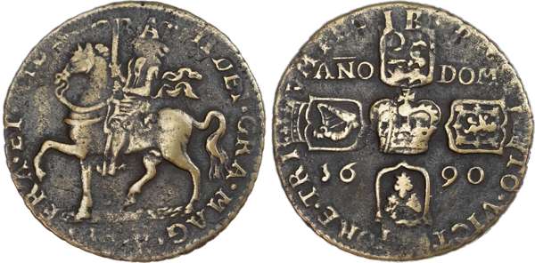 Ireland, James II (1685‑91), ‘Gunmoney’ Crown, 1690, Dublin mint, overstruck on large size halfcrown (1689‑90). King on horseback left. Rev, crown at centre, crowned cruciform shields surrounding, five strings to Irish harp, date in angles, 11.33gm (S. 6578; DF 366; KM 103). Good Fine, a few hints of undertype both sides at 12 o’clock.