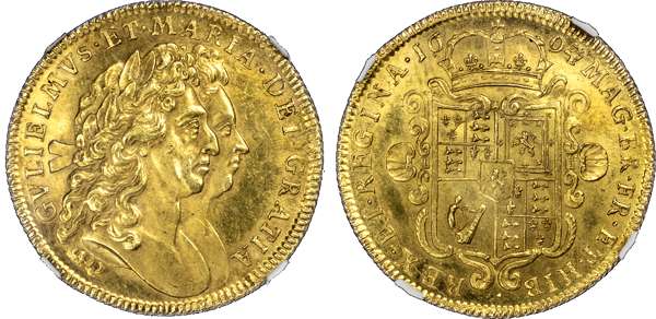 William and Mary (1689‑94), Two Guineas, 1694/3 conjoined busts right, toothed borders both sides, legend surrounding, GVLIELMVS ET MARIA DEI GRATIA. Rev, crowned quartered shield of arms with scalloped frame, date either side of crown, reads MAG BR FR ET HIB REX ET REGINA (S.3424; MCE 146; cf. Schneider II, 463/464; ). An exceptional example with an extraordinary level of detail and precision, in both the obverse conjoined busts and reverse quartered shield. Tiny nick in portrait, otherwise much as struck. Lustrous satiny toning, a combination of amber like gold displaying the underlying mint bloom, closer to a proof coin that a currency type, reverse fleur de coin. One of the finest examples available for commerce, encapsulated and graded by NGC as Mint state 63, rare so well preserved.