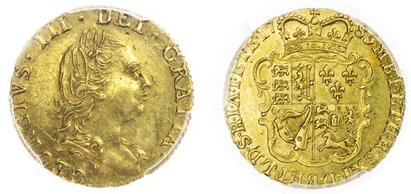 George III (1760‑1820), Half‑Guinea, 1785, fourth laureate head right, reverse crowned shield, grained edge, (EGC 825 ‘R2’; S.3734). Encapsulated by PCGS as AU58.