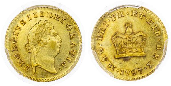 George III (1760‑1820), Third‑Guinea, 1797, laureate head right, reverse crown, (EGC 867; S.3738). Encapsulated by PCGS as MS62.