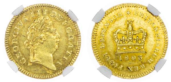 George III (1760‑1820), Third‑Guinea, 1803, laureate head right, reverse crown, (EGC 873; S.3738). Encapsulated by NGC as AU details obv. scratched.