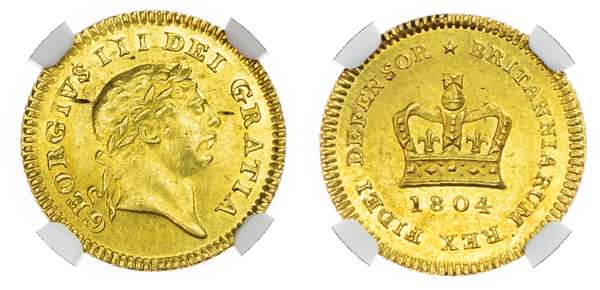 George III (1760‑1820), Third‑Guinea, 1804, second laureate head right, reverse crown, (EGC 874; S.37340). Encapsulated by NGC as MS62
