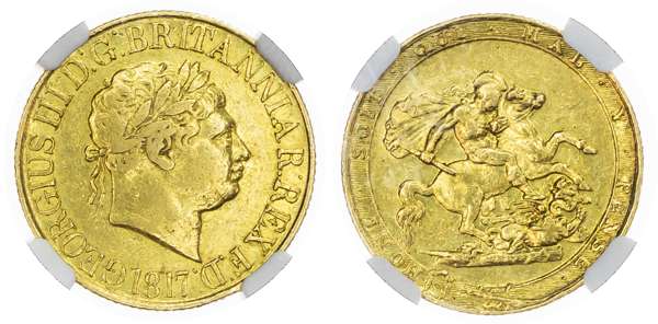 George III (1760‑1820), Sovereign, 1817, first laureate head right, date below, legend surrounds from the lower left. Reverse, Saint George slaying the dragon right, (S.3785; EGC 895; Marsh 1). About very fine the reverse better. Encapsulated by NGC as AU details Cleaned (though it is not obviously so)