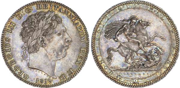 George III (1760‑1820), Crown, 1819 LIX. Laureate head right, Pistrucci below truncation, date below, toothed borders, legend reads GEORGIUS III DG BRITANNIARUM REX FD. Rev, St. George slaying dragon right, Pistrucci in exergue, legend surrounds HONI SOIT QUI MAL Y PENSE (order of the garter motto) edge inscription DECUS ET TUTAMEN* ANNO REGNI LIX* (S. 3787; Bull 2010; ESC 215). Extremely Fine or better, attractively toned.