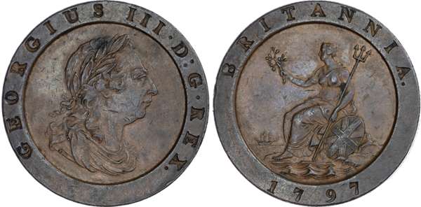 George III (1760‑1820), Twopence, 1797, cartwheel type. Laureate head right, ten leaves. Rev, Britannia seated left (S. 3776; BMC 1077). Extremely Fine, slightly mottled but attractive tone.