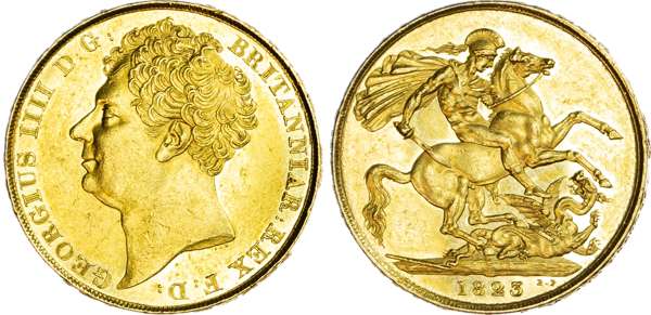 George IV (1820‑1830), Two Pounds, 1823, laureate head left, reverse St. George and Dragon, edge lettered DECUS ET TUTAMEN. ANNO REGNO IV, (EGC 945; S.3798). Good extremely fine with underlying mint brilliance.