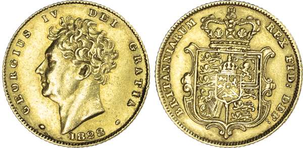 George IV (1820‑1830), AV Half‑Sovereign 1828. Bare head left, rev. Crowned garnished shield, edge milled, (Marsh 409; EGC 1003; S 3804). About Extremely Fine.
