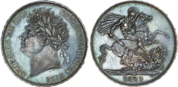 George IV (1820‑30), Crown, 1821, laureate head left, legend surrounding GEORGIUS IIII D G BRITANNIAR REX F D. Rev, St George and dragon right, date in exergue, B.P. to upper right of exergue. Edge inscription DECUS ET TUTAMEN. ANNO REGNI SECUNDO (S.3805; Bull.2310; ESC.246). Almost uncirculated, toned