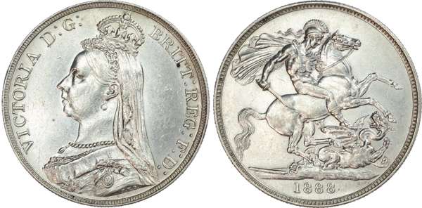 Victoria (1837‑1901), Crown, 1888, narrow date. Jubilee bust left. Rev, St. George slaying the dragon (S. 3921; Bull 2587; ESC 298). Extremely Fine or better, bright, scarce.