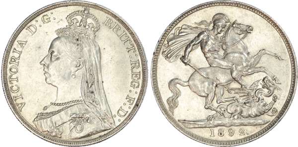Victoria (1837‑1901), Crown, 1892. Jubilee bust left. Rev, St. George slaying the dragon (S. 3921; Bull 2592; ESC 302). About Extremely Fine, some minor contact marks and carbon spots.
