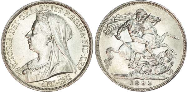 Victoria (1837‑1901), Crown, 1893, LVI. Veiled and draped bust left. Rev, St. George slaying the dragon (S. 3937; Bull 2593; ESC 303). Extremely Fine or better, bright.