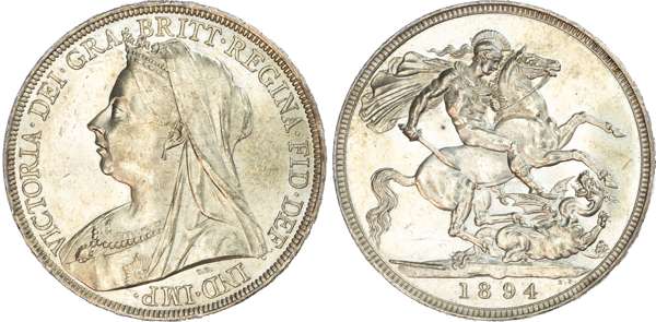 Victoria (1837‑1901), Crown, 1894, LVIII. Veiled and draped bust left. Rev, St. George slaying the dragon (S. 3937; Bull 2597; ESC 307). Usual contact marks nevertheless virtually Uncirculated, scarce.