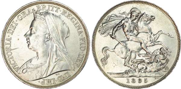 Victoria (1837‑1901), Crown, 1895, LVIII. Veiled and draped bust left. Rev, St. George slaying the dragon (S. 3937; Bull 2598; ESC 308). Small scrape to obverse field, bright, still Extremely Fine or better.