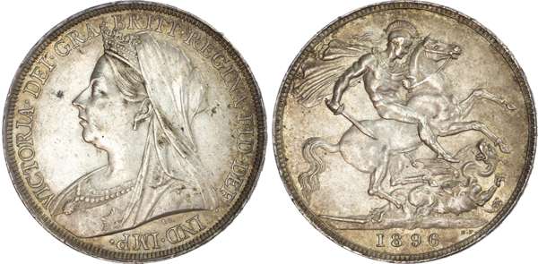 Victoria (1837‑1901), Crown, 1896, LX. Veiled and draped bust left. Rev, St. George slaying the dragon (S. 3937; Bull 2601; ESC 311). Near Extremely Fine.
