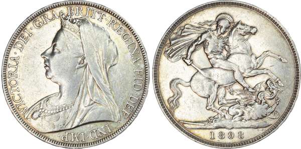 Victoria (1837‑1901), Crown, 1898, LXII. Veiled and draped bust left. Rev, St. George slaying the dragon. (S. 3937; Bull 2605; ESC 315). Good Very Fine, scarce.