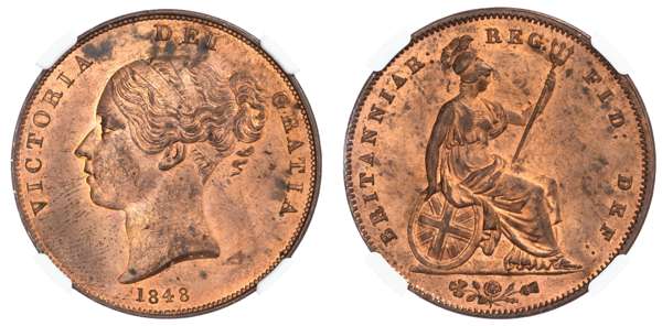 Victoria (1837‑1901), Penny, 1848, young head left, date below, reverse Britannia helmeted seated right with shield and ornamental trident, emblems in exergue. (BMC.1496; S.3948). Choice mint state, with full red mint lustre. Only the slightest toning marks. Encapsulated by NGC as MS63 RD. Exceptional example, very seldom do you see a full “Red” attribution from NGC.