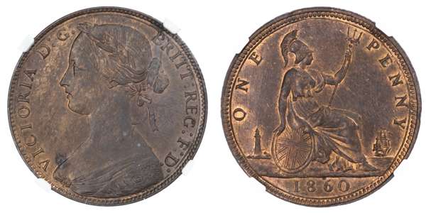 Victoria (1837‑1901), Bronze Penny, 1860, Tooth Border, young bust left, reverse Britannia std. right, with shield and trident (S.3954; BMC.1629; F.10 dies 2 + D). Uncircualted with lustre on both sides. Conservatively graded and encapsulated by NGC as MS62 Brown.