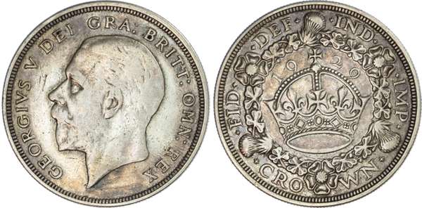 George V (1910‑36), Crown, 1929, wreath type. Bare head left. Rev, crown and date within wreath (S. 4036; Bull 3636; ESC 369). Good Fine, scarce, only 4,994 struck.