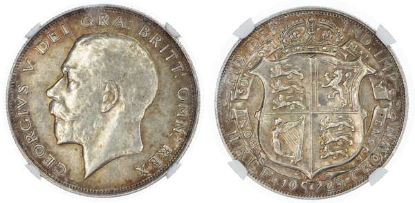 George V (1910‑1936), Halfcrown, 1925, shallow portrait bare head left, reverse crowned shield in Garter (ESC 3727; ESC772; S.4021A). Near extremely fine for this weakly struck issue. Key Date. Encapsulated by NGC as AU.