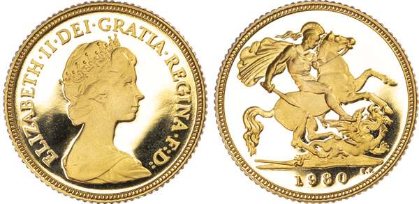 Elizabeth II (1952‑2022), Proof Half Sovereign, 1980, bust right by Arnold Machin, legend reads ELIZABETH II DEI GRATIA REGINA FD. Rev, Saint George slaying the dragon, date in exergue with small BP for Pistrucci (S. SB1). FDC, in case of issue with certificate.
