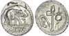 Julius Caesar (49‑48 BC) AR Denarius, moving mint travelling with Caesar, 3.75g. Elephant advancing right, trampling a horned serpent, CAESAR in exergue Rev. Emblems of the Pontificate, culullus, aspergillum, axe, and apex. (Crawford 443/1; Julia 9; Sydenham 1006). Extremely Fine.