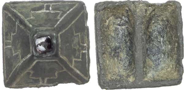 Anglo‑Saxon (c. AD 750‑1000) Sword Pyramid, leaded bronze and garnet (14x11mm, 3.36g). A leaded bronze Anglo‑Saxon sword pyramid, with engraved stepped decoration on all sides and topped with a single garnet. Fastening bar is present on the underside. (For similar, see Mortimer Type 1vii). Slight chip to one edge, otherwise in a good state of preservation.