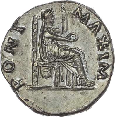 [A VITELLIVS] GERM P AVG TR P, laureate head of Vitellius right. Rev. PONT MAXIM, Vesta, veiled and draped, seated right on throne, holding sceptre and patera. (RIC 107; BMC 34-37; RSC 72). Extremely Fine.