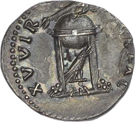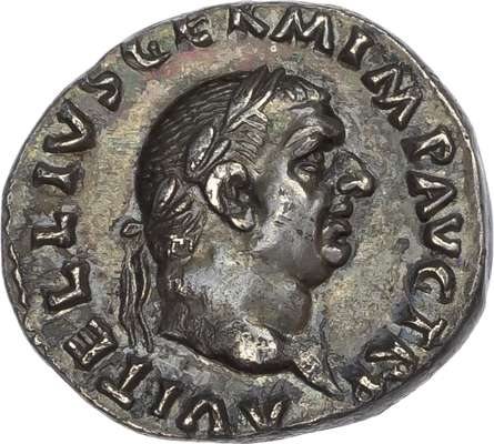 A VITELLIVS GERM P AVG TR P, laureate head of Vitellius right. Rev. XV VIT SACR FAC, tripod topped with dolphin on globe, raven below. (RIC 109; BMC 39-40; RSC 111). Extremely Fine. Beautifully toned.