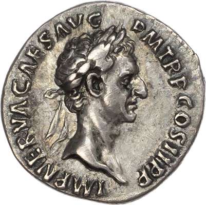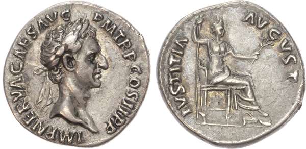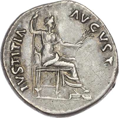 IMP NERVA CAES AVG PM TR P COS II P P, laureate head of Nerva right. Rev. IVSTITIA AVGVST, Justitia seated right on throne, holding sceptre and branch. (RIC 6; BMC 13-4; RSC 99). Extremely Fine. Cabinet tone. Portrait struck in relatively high relief. A superb piece.