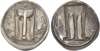 ϘΡΟ, tripod, with legs terminating in lion’s feet, three handles and snakes rising from the top, crab to right. Rev. Incuse of obverse design. (HN Italy 2085). Good Very Fine. Scarce variety with crab.