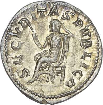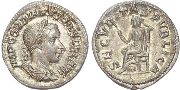 IMP GORDIANVS PIVS FEL AVG, laureate, draped and cuirassed bust of Gordian III right. Rev. SECVRITAS PVBLICA, Securitas seated left, holding sceptre. (RIC 130). Good Extremely Fine.
